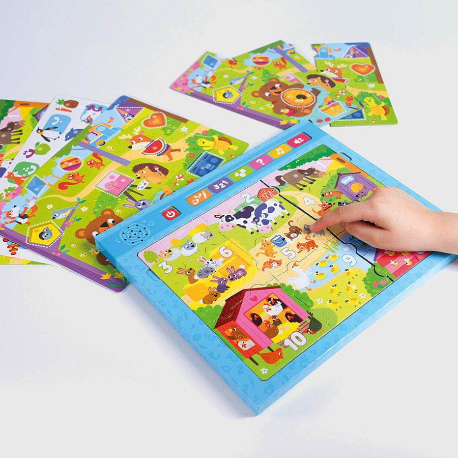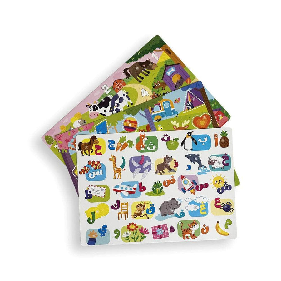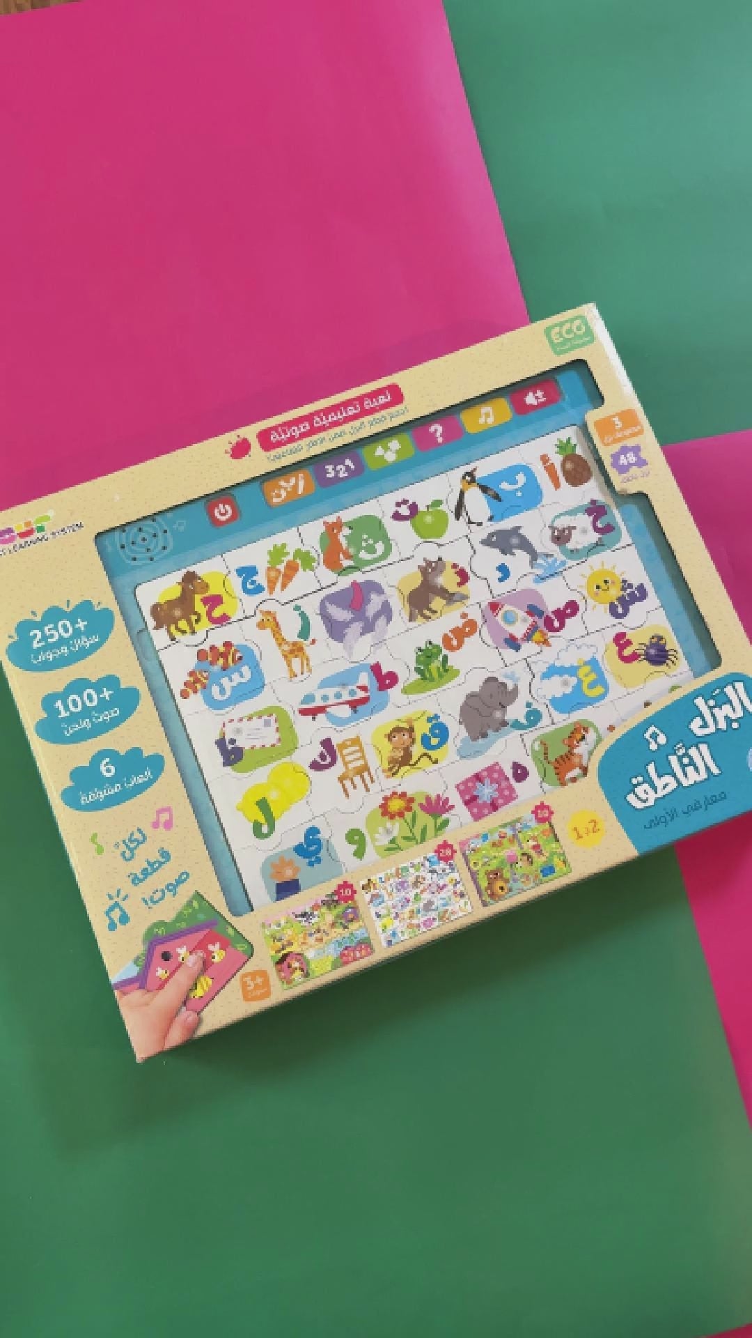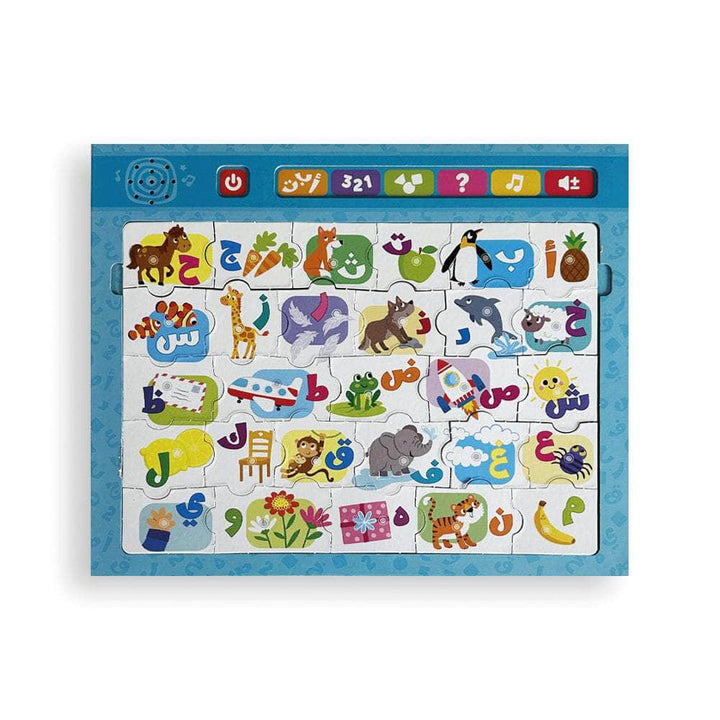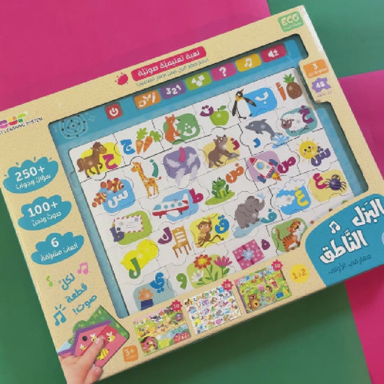 تعلَّمِ الحروفَ الأبجديَّةَ، والأرقامَ، والأشكالَ، باستخدامِ هذا الإطارِ التَّفاعليِّ الفريدِ! قُمْ بتجميعِ قطعِ البَزلِ الملوَّنةِ، اضغطِ الأزرارَ.. تعلَّمْ، واستمعْ، والعبْ