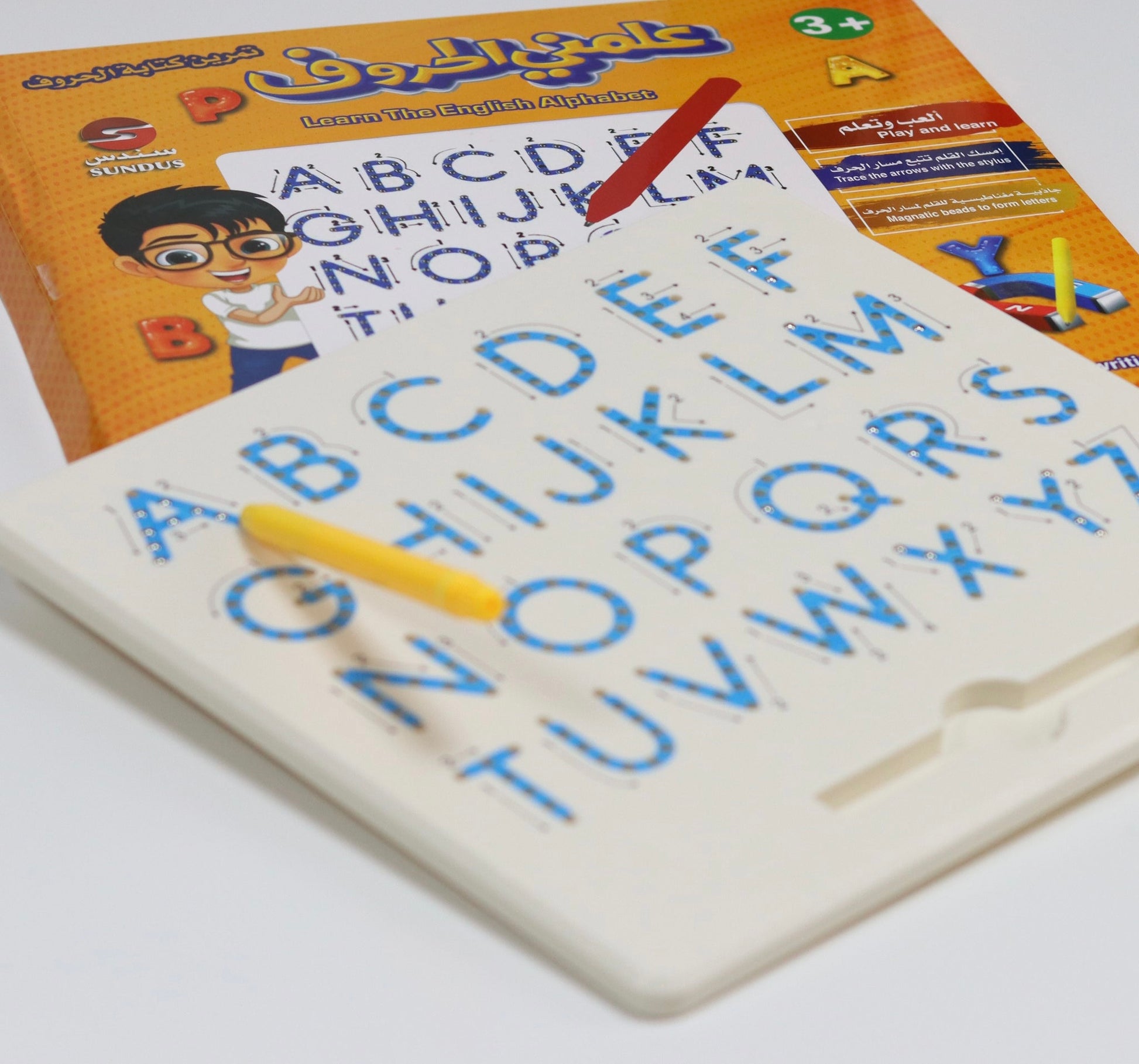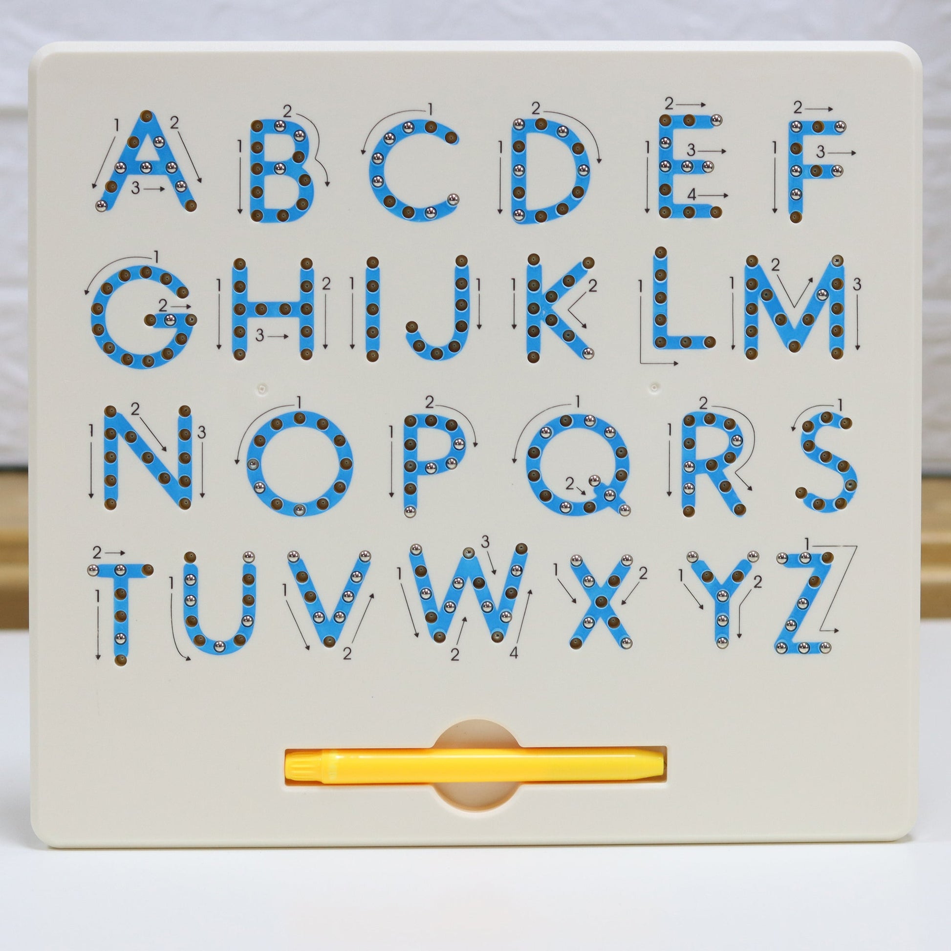 لوح كتابة مغناطيسية مخصص للصغار لتعليمهم كيفية كتابة الحروف الإنجليزية وتطوير مهاراتهم بطريقة أكثر سهولة وابتكاراً دع طفلك يتدرب على كتابة 26 حرفاً بشكل صحيح عن طريق تتبع الأسهم باستخدام القلم المغناطيسي على الخرزات التي تشكّل كل حرف على حدى.